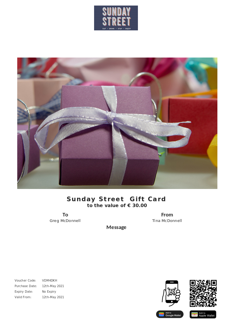 Sunday Street allows you to purchase instantly printable gift vouchers, special offers and tickets using the Voucher Connect platform.